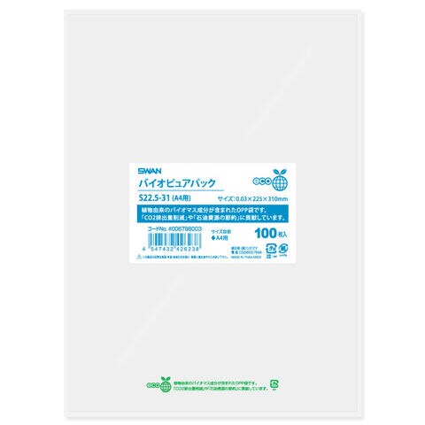 シモジマ OPP袋 バイオピュアパック S22.5-31(A4用) 100枚入り|バイオマス 透明袋 使い捨て 006798003