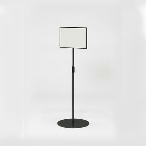 | 商品仕様 | ●板面が落下を防ぐ枠カバー付き。●片面ずつ異なる表示を入れることもできます。●ポール部分を上下させて高さ調整も可能です。 ●規格:A4ヨコ●外寸:幅330×奥330×高895~1335mm●ベース径:330mm●板面サイズ:縦215×横300mm●表示画面:縦201×横288mm●重量:3.6kg●材質:枠/ベース/ポール=スチール板粉体塗装,連結樹脂=ABS樹脂,板面=PET/厚紙,枠カバー=スチール●マグネット,六角レンチ付 |
