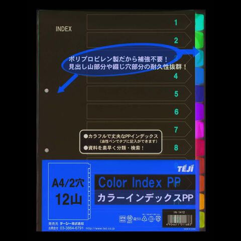 テージー カラーインデックスPP A4 2穴 12色 50組 IN-1412