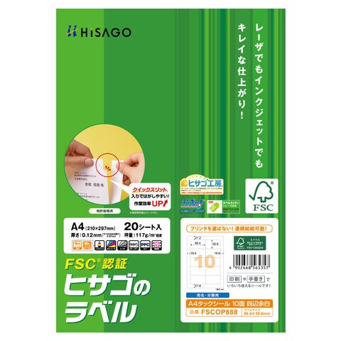 ヒサゴ タックシール A4 10面 四辺余白 FSCOP888