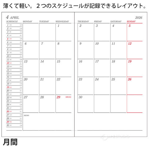 月間ページの端にもう一つ横罫のマンスリー欄があり、2つのスケジュールを管理・記録できます。