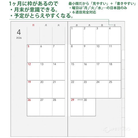 ハンディピック「土橋式」:ステーショナリーディレクターが考えた最強ツールマンスリーページの特徴:1ヶ月に枠があるので予定が捉えやすくなり、月末も意識しやすいレイアウトになっています。