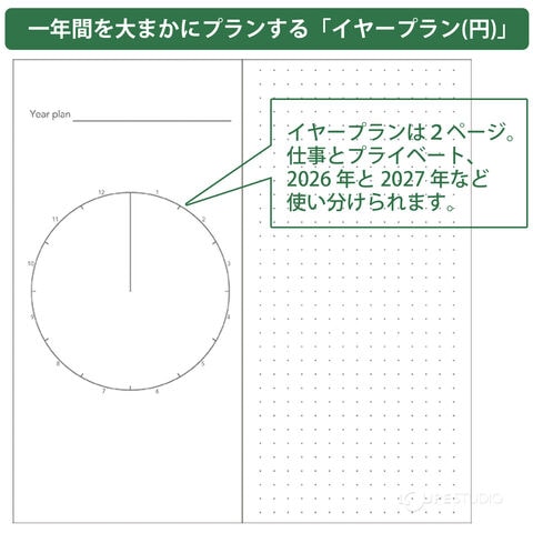 イヤープランページ(円)の特徴:1年の予定を大まかに円でとらえると時間が有限であることを実感でき、1年を大切に過ごせるようになります。