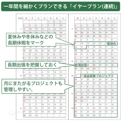こちらのイヤープランは色で月の区切りを表現しているので、連続した長期の予定や月をまたいだプロジェクトなども管理しやすい工夫が施されています。