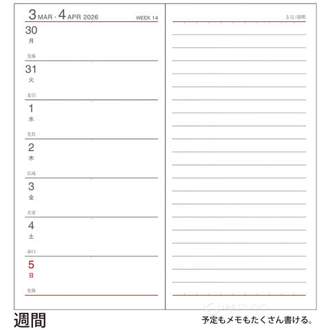 週の予定が見開きで管理できる人気のレイアウトです。1週間の予定をざっくり把握したい人やフリースペースにメモをたくさん書きたい人におすすめです。