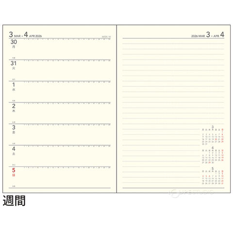 左半分が1週間のスケジュール、右半分が横罫のメモスペースになっており1週間の予定とメモを見開きで管理できる人気のレイアウトです。
