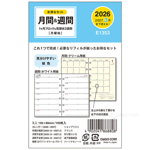 ダイゴー 手帳 2026年 1月始まり 2025年 12月始まり マンスリー+ウィークリー ミニ6リフィル 1Mブロック&2W スケジュール帳 ビジネス手帳 プレゼント 就職祝い 新成人 男性 女性 令和8年 DAIGO