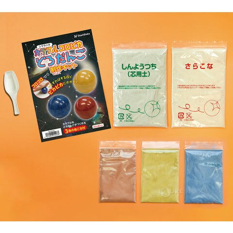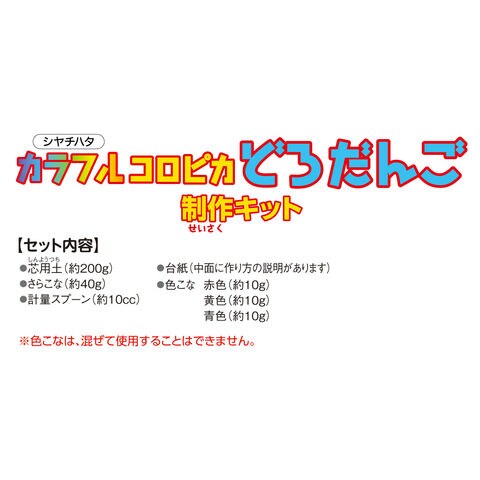| セット内容 | カラフルコロピカどろだんご制作キット/芯用土(約200g) さらこな(約40g) 色こな 赤色(約10g)/黄色(約10g)/青色(約10g) 計量スプーン(約10cc) 台紙(中面に作り方の説明があります) |