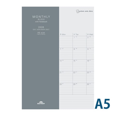 レイメイ スケジュール帳 ノート 2026年 1月始まり 2025年12月 システムノートダイアリー マンスリー ブロック ノート付 A5サイズ マンスリー ビジネス手帳 プレゼント 就職祝い 新成人 男性 女性スペック