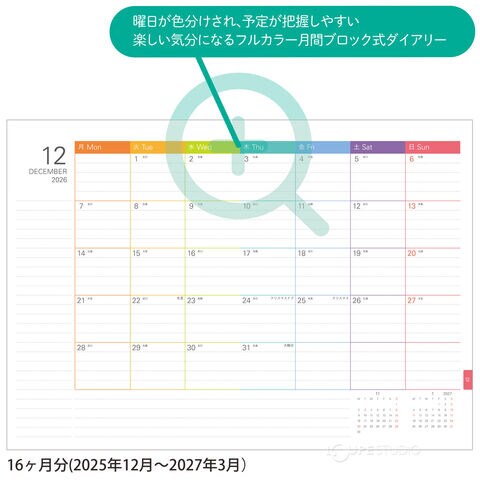 | 主レイアウト | 1ヶ月ブロックカラー 見開き1ヶ月 |