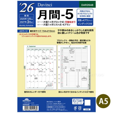 レイメイ藤井 手帳 2026年 1月始まり 2025年12月 システム手帳用 リフィル ダヴィンチ 月間5 A5サイズ A5 マンスリー スケジュール帳 ビジネス手帳 プレゼント 就職祝い 新成人 男性 女性