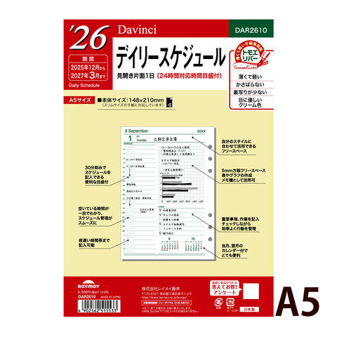 レイメイ藤井 手帳 2026年 1月始まり 2025年12月 システム手帳用 リフィル ダヴィンチ デイリー A5サイズ A5 デイリー スケジュール帳 ビジネス手帳 プレゼント 就職祝い 新成人 男性 女性スペック