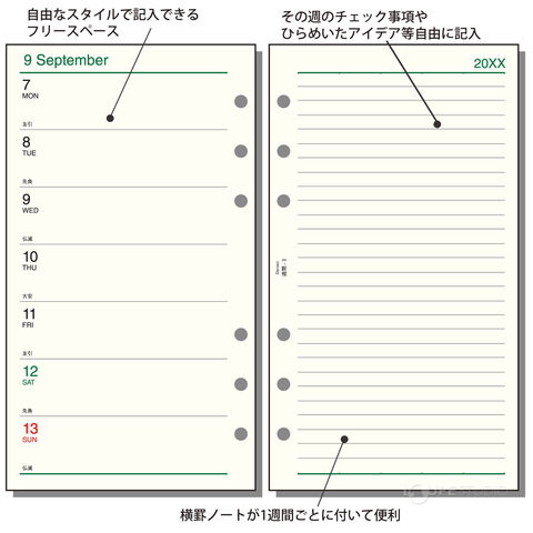 | 主レイアウト | 片面1週間+片面横罫ノート |