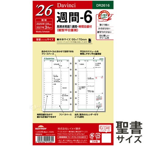レイメイ藤井 手帳 2026年 1月始まり 2025年12月 システム手帳用 リフィル ダヴィンチ 週間6 バイブルサイズ ウィークリー スケジュール帳 ビジネス手帳 プレゼント 就職祝い 新成人 男性 女性スペック