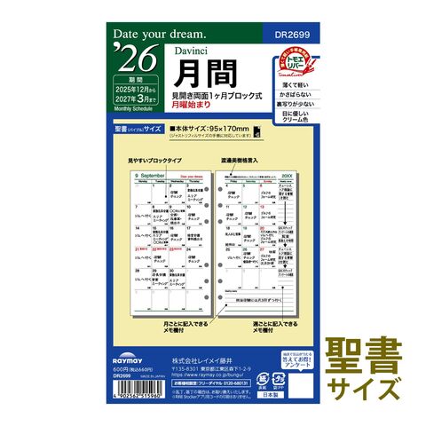 レイメイ藤井 手帳 2026年 1月始まり 2025年12月 システム手帳用 リフィル ダヴィンチ Date you dream. バイブルサイズ マンスリー スケジュール帳 ビジネス手帳 プレゼント 就職祝い 新成人 男性 女性
