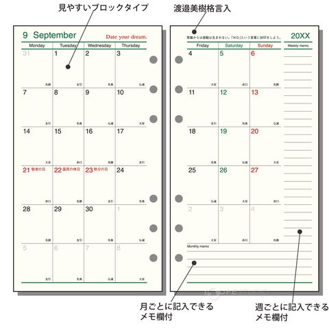 | 主レイアウト | 見開き両面1ヵ月ブロック式 |