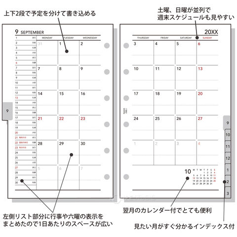 主レイアウト見開き両面1ヵ月ブロック式