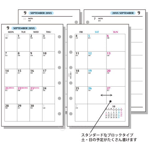 | 主レイアウト | 見開き両面1カ月ブロック式+見開き両面2週間。 |