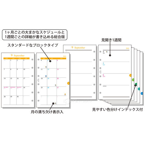 主レイアウト見開き両面1カ月ブロック式+見開き両面1週間。