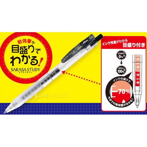 メディアで話題、インクに目盛りがついたサラサクリップ。残量が分かるので、インクの減り具合で達成感が味わえます。水性顔料インクなので耐水性・耐光性に優れています。