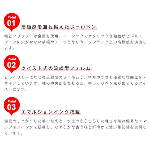 ツイスト式エマルジョンインク(なめらか油性インク)搭載ボールペン。耐水性に優れており、公式文書にも使用できます。大切な人への贈り物にも、ワンランク上の普段使いにも。
