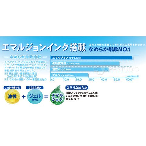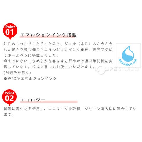 油性のしっかりした手ごたえと、ジェル(水性)のさらさらした軽さを兼ね備えたエマルジョンインクを、世界で初めてボールペンに搭載しました。今までにない、なめらかな書き味と鮮やかで濃い筆記線を実現しています。公式文書にもお使いいただけます。