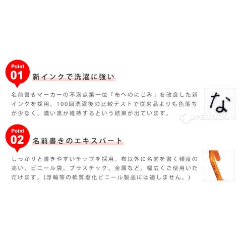 - 特に衣類(ハンカチ・ワイシャツ・体操着・運動靴等)の名前書きに適しています。ビニール、プラスチック、金属、革、ガラス、紙等にもご利用になれます。