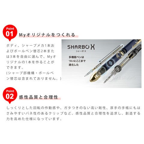 ボディ、シャープメカ1本及びボールペン替芯3本を自由に選んでMyオリジナルの1本を作ることができる。ボールペン2種、シャープ1種タイプ。