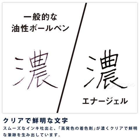 エナージェルインキ採用。軽くなめらかな書き味。濃くはっきりとした文字が書け、速記にも強く、乾きも速い。