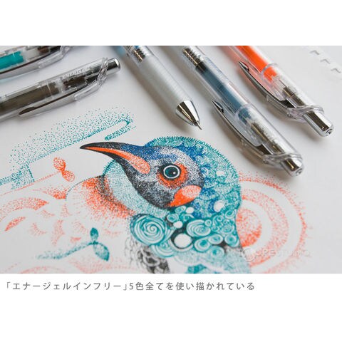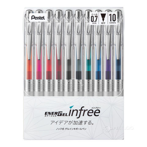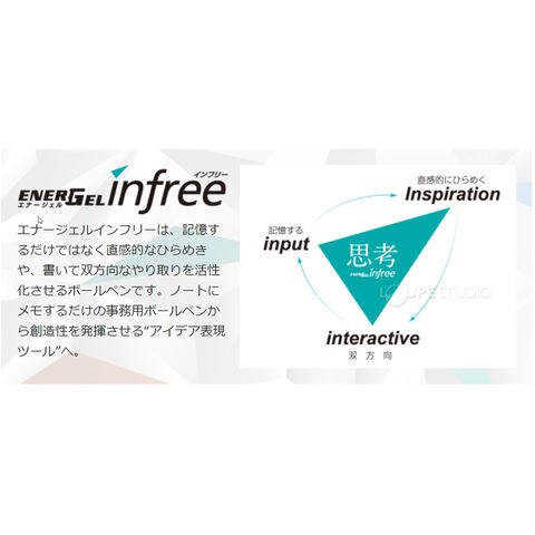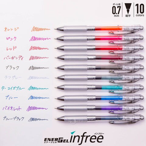 - "なめらかな書き心地"、"筆跡の速乾性"、"濃く鮮やかな筆跡"が特長のエナージェルインキは、インフリー以外にもさまざまなエナージェルシリーズに搭載され、発売20年を迎えた今なおご愛用され続けている信頼のインキです。