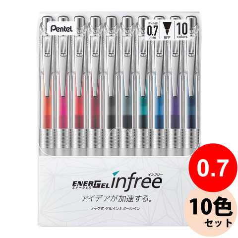 ぺんてる Pentel ボールペン 10色セット 0.7mm 細字 水性 文具 文房具 筆記用具 ビジネス オフィス 学校 エナージェル インフリー 砲弾チップ おすすめ 人気 書きやすいスペック