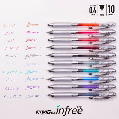 - "なめらかな書き心地"、"筆跡の速乾性"、"濃く鮮やかな筆跡"が特長のエナージェルインキは、インフリー以外にもさまざまなエナージェルシリーズに搭載され、発売20年を迎えた今なおご愛用され続けている信頼のインキです。