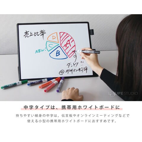 ペン先がボードにしっかりフィットするから、安定して書きやすい新感覚のホワイトボードマーカーです。自由自在な筆跡とカラーインキで、もっと見やすく!伝わる!広がる!