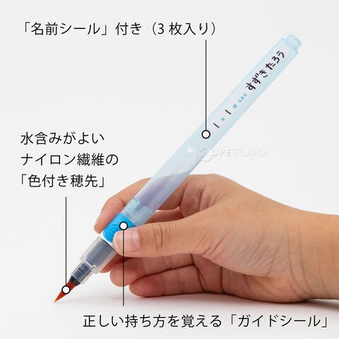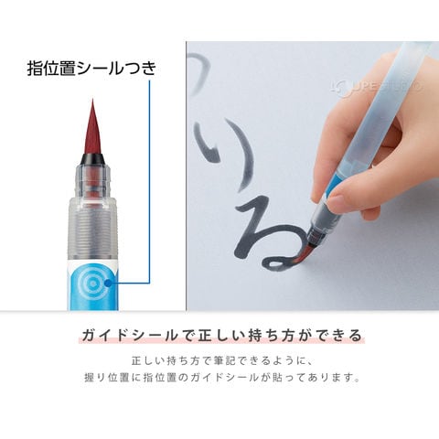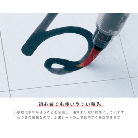 小学校の書写の授業で使用する水書シート専用みず筆です。正しい持ち方を覚える指位置シールつき。ぺんてるの筆ペン技術を用いた本格派なみず筆です。