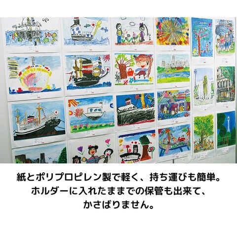 作品を横から差し込むだけ。ホルダーはミシン目でつながっているので、展示スペースに合わせて切り離して使えます。紙とポリプロピレン製で軽く、持ち運びも簡単。ホルダーに入れたままでの保管も出来て、かさばりません。