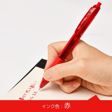 エナージェルインキ採用。軽くなめらかな書き味。濃くはっきりとした文字が書け、速記にも強く、乾きも速い。ノックしてすばやく書けます。