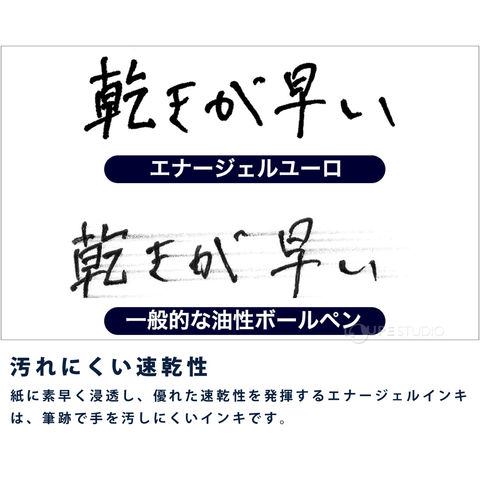 エナージェルインキ採用。軽くなめらかな書き味。濃くはっきりとした文字が書け、速記にも強く、乾きも速い。スリム&ライトボディで長時間の筆記でも疲れません。エントリーシートや履歴書の記入に最適です。