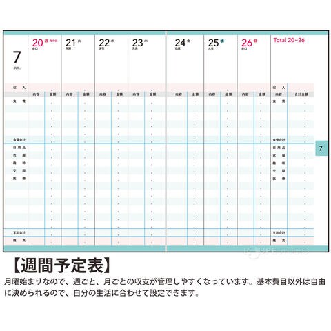 | レイアウト | 家計簿、週間、週計タイプ |