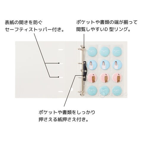 ポケットや書類の端が揃って閲覧しやすいD型リング。表紙の開きを防ぐセーフティストッパー付き。ポケットや書類をしっかり押さえる紙押さえ付き。A4クリヤーホルダーが入る表紙ポケット。取り出しやすいフィンガーホール。ラベリングやデコレーションができる背見出し紙付き。