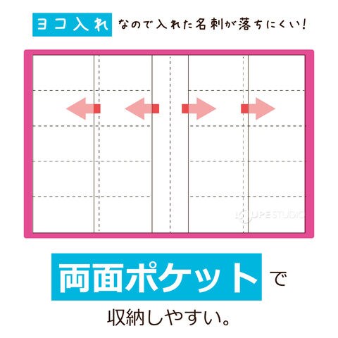 - 名刺の出し入れがしやすく、見開きで閲覧しやすい両面ポケットタイプ。