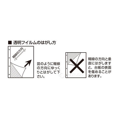 - フリー台紙は写真等をいったん貼ると台紙からはがれなくなっていることがあり、無理にはがそうとすると写真を破損する事があります。その場合はドライヤーで写真の表面を全体に約3分ほど暖めた後、冷風で冷ましてから端の方よりゆっくりとはがして下さい。はがしやすくなります。