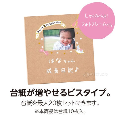 | 仕様 | 内ビス式 表紙にフォトフレーム付(L判写真収容可能) クラフト台紙入ポケット10枚 台紙サイズ/縦231×横194mm |
