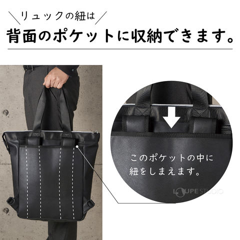 - ショルダー紐のフックを外し、背面のポケットに収納すれば、見た目もスッキリとしたトートバッグに変身。