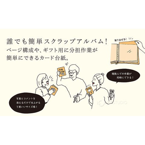 - アルバム本体から出し入れが可能な、カードタイプのスクラップ台紙。ページ構成が自由自在、ギフトの際にカード台紙を取り出して配れば、同時に複数人での作業が可能。