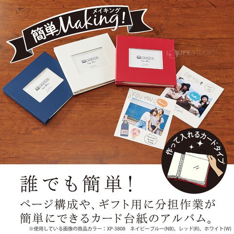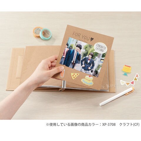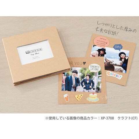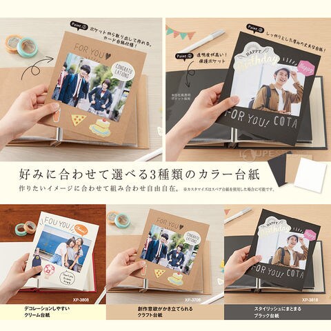 | 仕様 | XP-3708/クラフト台紙8枚入り XP-3808/クリーム台紙8枚入り XP-3818/ブラック台紙8枚入り 内ビス式 カード台紙サイズ171×153mm 1ページにL判写真・ハガキサイズが1枚貼れます。 |