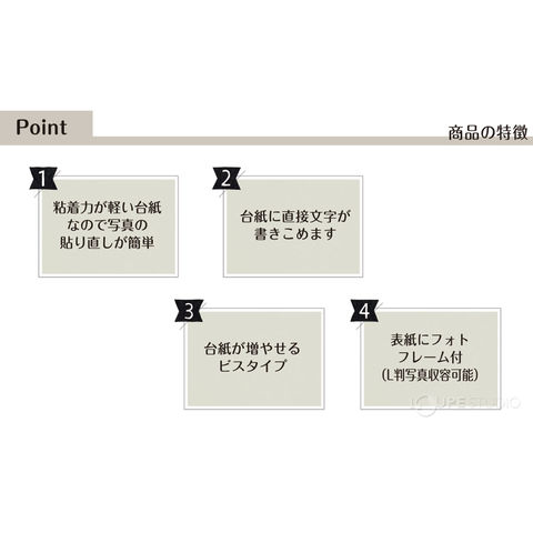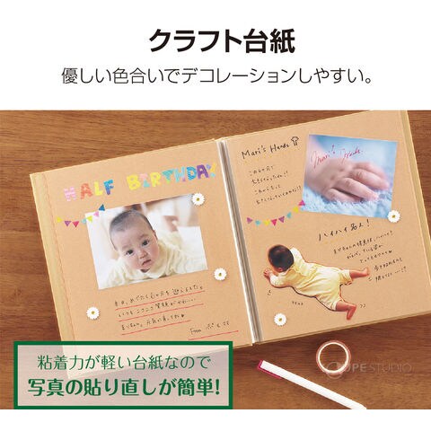 - 粘着力が軽い台紙なので、写真の貼り直しが可能です。