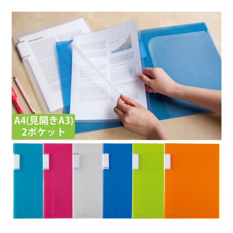 2ポケットフォルダー A4 ファイル 文具 収納 整理 色分け 事務用品 オフィス 学校 ブルー クリア ピンク オレンジ グリーン スペック