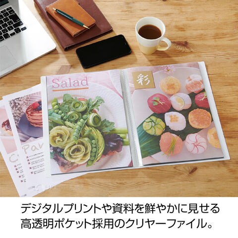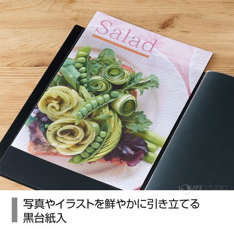 - デジタルプリントや資料を鮮やかに見せる高透明ポケット、黒台紙付きのクリヤーファイル