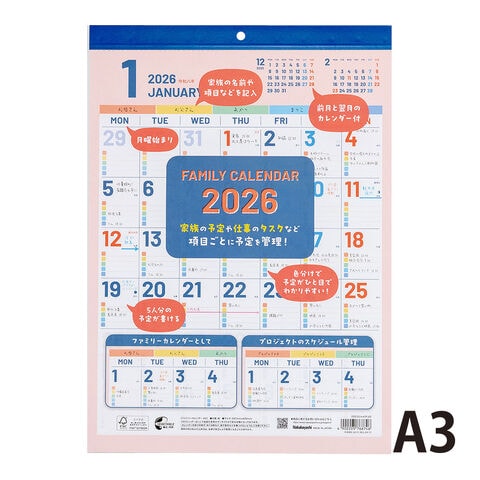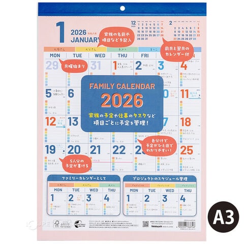 ナカバヤシ カレンダー 壁掛けタイプ 2026年 シンプル 大きい 文具 家族 FSC-MX 壁掛けカレンダー ファミリー A3 1月始まり めくる 月曜始まりスペック