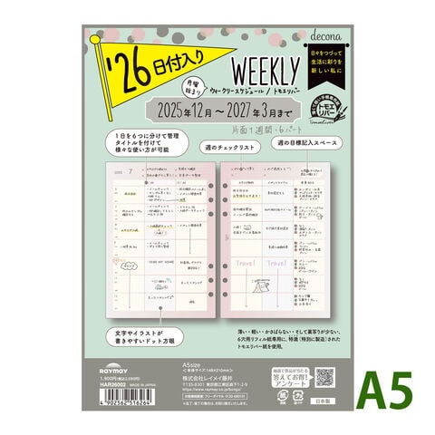 レイメイ藤井 手帳 2026年 システム手帳用 リフィル マンスリー 月曜始まり 12月始まり スケジュール帳 ビジネス 差し替え ダヴィンチ 月間-1 Raymay 24D/V mini5スペック